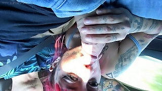 Tattooed goth whore Candy Doll gives a fellatio in the car and gets fucked in public