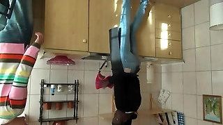 Kitchen BJ and buttfuck quickie with an asian maid in white stockings