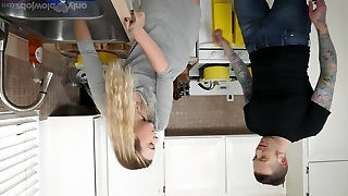 Pretty pigtailed chick Kylie Moore is cleaning the house and taking trunk between her legs
