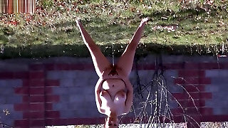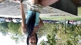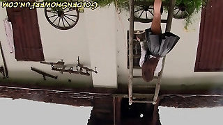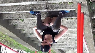 Raven haired filthy girl finds pissing on stairs highly captivating