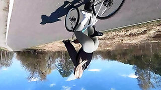 Platinum-blonde cyclist flashes peach buddy to her partner and fucks in public park