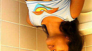 Lewd chubby Asian bitch plays with her udders and twat in the restroom