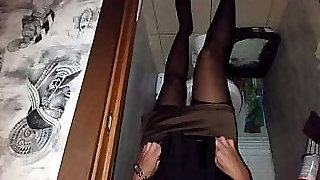Asian schoolgirl sweet nubile Ladyboy upskirt and cum on her pantyhose on public rest room