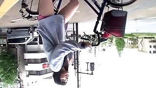 Flatchested juvenile dark brown widens her legs outdoors to shove vibrator up her cooch