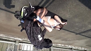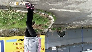 Heterosexual haired emo gal pulls down black jeans to pee at the bus parking