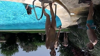 Double Teaming a Sexy Bathing Suit Girl by the Pool in 3 Way