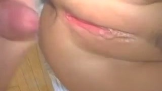 Rubs his dick on her and jizzes on the pussy