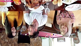 Small jugged, blonde honey is getting banged during a family lunch and eating pussy along the way